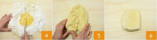 Schneiden Sie dann eine Vanilleschote auf und kratzen Sie mit der Messerklinge die Samen heraus 4. Geben Sie sie dann in die Mitte der Fontäne; fügen Sie auch den Puderzucker und die Haselnusspaste hinzu 5 und beginnen Sie schnell zu kneten 6, bis Sie eine kompakte und glatte Konsistenz erhalten.