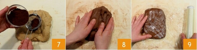 Bestäuben Sie den Mürbeteig mit dem gesiebten Kakaopulver 7 und kneten Sie es in den Teig 8. Sobald Sie einen glatten und kompakten Teig erhalten haben, drücken Sie ihn leicht flach und wickeln Sie ihn in Frischhaltefolie 9: Lassen Sie ihn mindestens 30 Minuten im Kühlschrank ruhen.