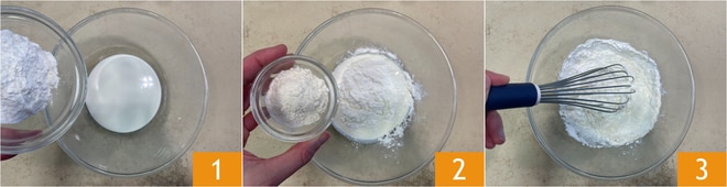Um den Gianduia-Pudding mit Orangensauce zuzubereiten, geben Sie die Sahne, die Maisstärke 1 und das Mehl 2 in eine Schüssel und verrühren Sie alles mit dem Schneebesen 3.
