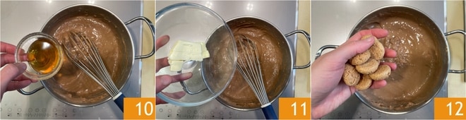 Gießen Sie den Amaretto-Likör 10 dann die Butter 11 dazu und lassen Sie sie schmelzen. Jetzt fügen Sie die mit den Händen zerbröselten Amaretti hinzu 12.