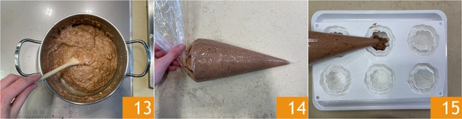 Nochmals umrühren 13 und die Mischung in einen Spritzbeutel umfüllen 14, dann die Puddingformen aus Silikon füllen 15. Die Mengen beziehen sich auf 4 Formen à 150 g.