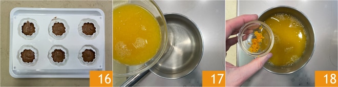 Für 6 Stunden in den Gefrierschrank stellen 16. Bereiten Sie die Orangensauce vor: Geben Sie den Orangensaft 17 und die Schale 18 in einen Topf und erhitzen Sie es.