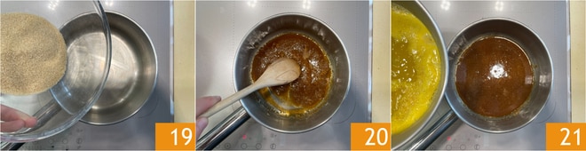 Gleichzeitig in einem anderen Topf den braunen Zucker 19 geben und bei schwacher Hitze schmelzen 20. Nun den erwärmten Saft in drei Etappen zum Karamell geben 21.