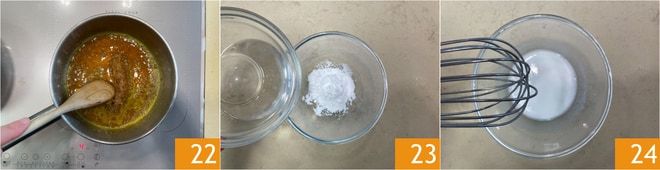 Aufkochen lassen 22 und in der Zwischenzeit in einer Schüssel die Stärke und den Orangenlikör 23 mischen, mit dem Schneebesen verdünnen 24