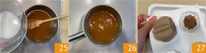 Integrieren Sie die Stärke in das Karamell 25, umrühren und abkühlen lassen 26. Sobald die Puddings fest geworden sind, aus der Form nehmen 27 und auf einen Servierteller legen.