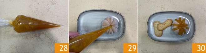 Die abgekühlte Orangensauce in einen Spritzbeutel geben 28 und die Puddings garnieren 29, mit Pistazienkeksen 30 abschließen