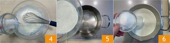 Gießen Sie nach und nach die Milch unter Rühren dazu 4 und geben Sie dann die Mischung in einen Topf auf den Herd 5, fügen Sie den Kristallzucker hinzu 6.