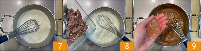 Sobald es kocht, noch 1 Minute unter ständigem Rühren kochen 7. Dann den Herd ausschalten und die Gianduia-Schokolade 8 dazugeben, gut umrühren, um sie zu schmelzen. Fügen Sie die zuvor in Wasser eingeweichte und ausgepresste Gelatine hinzu 9.