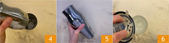 Schließen Sie mit dem oberen Teil und stellen Sie sicher, dass es gut versiegelt ist 4, schütteln Sie dann kräftig für ein paar Sekunden, bis der Shaker in den Händen gut gekühlt ist 5. Filtern Sie nun den Cocktail mit dem Strainer und gießen Sie ihn in das Servierglas 6.