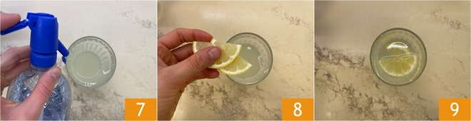 Fügen Sie abschließend die Soda direkt ins Glas hinzu 7. Garnieren Sie schließlich mit zwei Zitronenscheiben 8 und servieren Sie den Gin Fizz sofort ohne Eis 9.