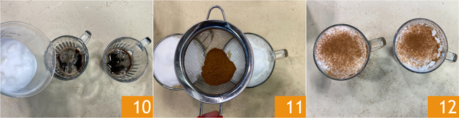 Zum Schluss garnieren Sie mit der aufgeschäumten Milch 10 und einer Prise Kakaopulver 11. Ihr Gingerbread Latte ist bereit, genossen zu werden 12!