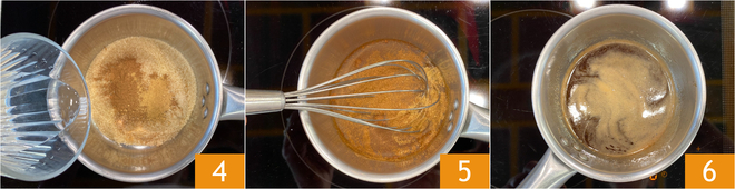 Fügen Sie auch das Wasser hinzu 4 und vermischen Sie die Zutaten mit einem Schneebesen 5. Stellen Sie den Topf auf den Herd und erhitzen Sie ihn bei mittlerer bis niedriger Hitze bis zum Kochen, dann kochen Sie ihn weitere 3 Minuten, bis die Mischung die Konsistenz eines Sirups erreicht 6. Schalten Sie die Hitze aus und stellen Sie den Sirup beiseite.