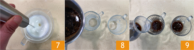In der Zwischenzeit schäumen Sie die Milch mit einem Milchaufschäumer zu einem weichen und gleichmäßigen Schaum auf 7. Bereiten Sie zuletzt den Kaffee vor. Um das Getränk zusammenzustellen, gießen Sie zuerst den Sirup in die Gläser 8, dann fügen Sie den Kaffee hinzu 9.