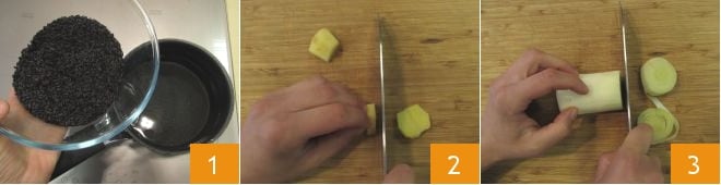 Um die Gläschen mit Venere-Reis und Schwertfisch zuzubereiten, geben Sie zuerst den Reis in reichlich Salzwasser 1 und kochen Sie ihn etwa 40 Minuten lang. In der Zwischenzeit schälen Sie den Ingwer und schneiden ihn grob 2, dann säubern Sie den Lauch und schneiden ihn in Ringe 3.