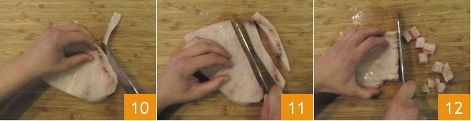 Kommen wir nun zur Zubereitung des Schwertfischstückes: Entfernen Sie die Haut 10 und schneiden Sie ihn zuerst in Streifen 11 und dann in Würfel 12.