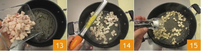 Erhitzen Sie einen Schuss Öl in einem Topf, fügen Sie die Schwertfischwürfel hinzu 13 und braten Sie sie etwa 5 Minuten lang bei starker Hitze an, wobei Sie mit geriebener Zitronenschale 14, Salz und Pfeffer abschmecken 15.