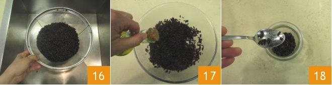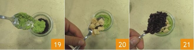 Nachdem die Kochzeit des Reises abgelaufen ist, lassen Sie ihn abtropfen 16 und geben Sie ihn in eine Schüssel, würzen Sie ihn dann mit einem Schuss Öl 17 und einer Prise Pfeffer und mischen Sie gut. An diesem Punkt können Sie Ihre Vorspeise zusammenstellen: Wir haben Gläser mit einem Durchmesser von 6,5 cm verwendet. Geben Sie als Basis eine erste Schicht Venere-Reis 18,