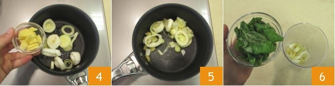 Erhitzen Sie einen Schuss Öl in einem kleinen Topf und lassen Sie den Lauch und den Ingwer für ein paar Minuten anbraten (4-5). Geben Sie das angebratene Gemüse in ein hohes, schmales Glas, fügen Sie die Basilikumblätter hinzu, die Sie zuvor gewaschen und getrocknet haben 6