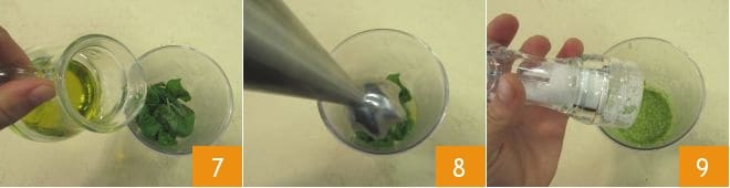 und die 30 g Öl 7. Pürieren Sie alles mit einem Stabmixer, bis Sie eine glatte und homogene Konsistenz erhalten 8, dann schmecken Sie mit Salz ab 9.