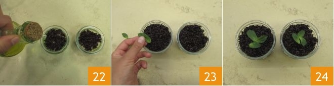 Schließlich garnieren Sie mit einem Schuss Öl auf der Oberfläche 22 und einigen frischen Minzblättern 23: Ihre Gläschen mit Venere-Reis und Schwertfisch sind bereit, warm oder bei Zimmertemperatur serviert zu werden 24!