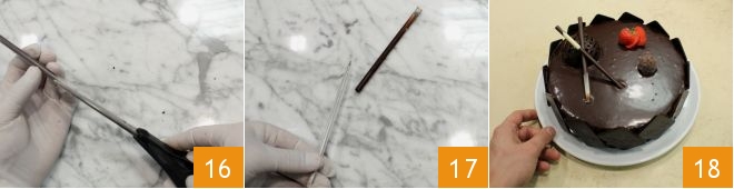 Nach einigen Minuten lösen Sie die Röhrchen, indem Sie mit einer Schere einen kleinen Schnitt machen, um Ihnen das Entfernen zu erleichtern 16 (alternativ können Sie einen Holzspieß verwenden). Ziehen Sie sie heraus 17 und verteilen Sie dann die vorbereiteten Dekorationen auf dem Guss: Fügen Sie die Halbkugel, die Röhrchen, einen Trüffel hinzu und vervollständigen Sie das Ganze, indem Sie die dunklen Schokoladenblätter um den Kuchen herum verteilen. Ihr glasierter Kuchen mit Schokoladen-Diplomatencreme ist fertig 18; um ihn zu vervollständigen und noch schöner zu machen, können Sie ein paar Erdbeeren hinzufügen!