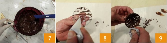 Wenn die Schokolade 28°C erreicht hat, geben Sie sie zurück in die Schüssel, in der Sie das restliche Drittel gelassen haben, und rühren Sie um: Die Schokolade sollte 31/32°C erreichen 7. Sollte die Temperatur in diesen Phasen zu stark sinken, halten Sie immer den Topf des Wasserbads mit heißem Wasser bereit, um die Schokolade leicht zu erwärmen. Andernfalls, wenn sie noch zu heiß ist, wiederholen Sie den Vorgang des Verteilens auf dem Marmor mit einem kleinen Teil der Schokolade. Füllen Sie nun ein Tütchen aus Pergamentpapier (oder einen Spritzbeutel ohne Tülle, in den Sie ein Loch machen können) mit der temperierten Zartbitterschokolade (bewahren Sie den restlichen Teil auf, da Sie ihn zur Herstellung der Röhrchen benötigen). Nehmen Sie kleine halbkugelförmige Fingerfood-Schälchen und zeichnen Sie Linien, um ein Gitter aus Schokoladenfäden zu erstellen, indem Sie das Tütchen im Zickzack bewegen 8. Wenn Sie fertig sind 9, säubern Sie den überschüssigen Schokoladenrand und stellen Sie die Schälchen in den Kühlschrank, um sie abzukühlen.