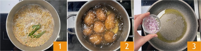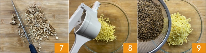 In der Zwischenzeit reiben Sie den Scamorza grob mit einer Reibe und hacken die Walnüsse grob 7. Wenn die Kartoffeln gar sind, pressen Sie sie mit einem Kartoffelstampfer in eine Schüssel 8, dann fügen Sie die Linsen hinzu 9.