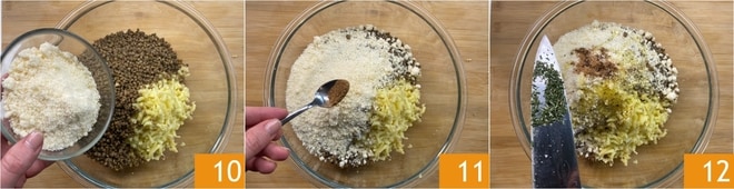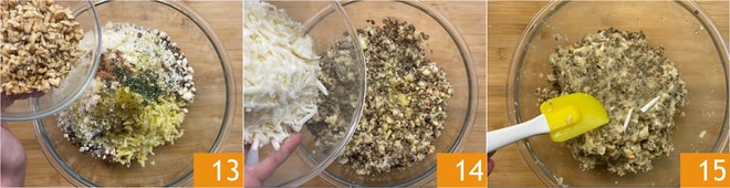 Fügen Sie auch die gehackten Walnüsse 13 und die Hälfte des geriebenen Scamorzas hinzu 14, dann salzen, pfeffern und mit einem Schuss Öl würzen. Kneten Sie zunächst mit dem Spatel und dann mit den Händen, um eine ziemlich feste Masse zu erhalten, wie die von Frikadellen 15.