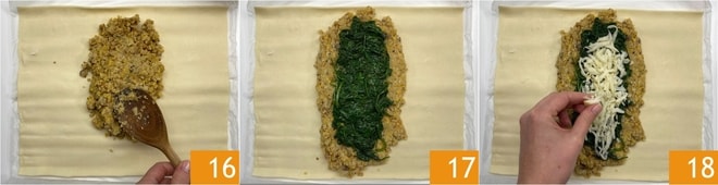 Sie sind bereit, den Braten zusammenzustellen: Rollen Sie den Blätterteig auf dem Backpapier aus, mit der langen Seite zu Ihnen hin. Verteilen Sie die Linsen- und Kartoffelmischung in der Mitte, achten Sie darauf, sie nicht zu fest auf den Teig zu drücken 16. Drücken Sie sie leicht in der Mitte und verteilen Sie den Spinat 17, dann fügen Sie den restlichen geriebenen Scamorza hinzu 18