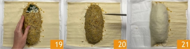 Formen Sie die Masse so, dass die Füllung bedeckt wird und einen Braten bildet 19. Schneiden Sie mit dem Messer Streifen auf der rechten Seite des Teigs, um Fransen von etwa 1,5 cm Breite zu erhalten 20. Nun bedecken Sie den Braten mit dem linken Teigstreifen 21.