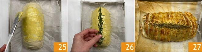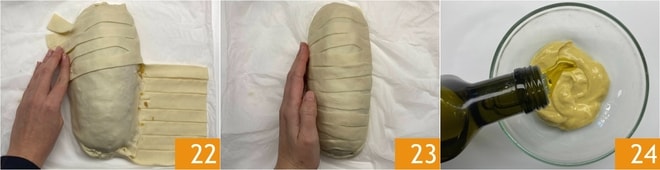 Überlappen Sie die Fransen der rechten Seite leicht, indem Sie sie überkreuzen 22. Formen Sie den Braten in der Kruste mit den Händen, um ihm eine möglichst regelmäßige Form zu geben 23, und legen Sie ihn auf ein Backblech. In einer kleinen Schüssel mischen Sie den Senf mit etwas Olivenöl 24.