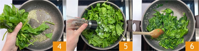 Fügen Sie den Spinat hinzu 4, salzen und pfeffern Sie 5. Wenn der Spinat zusammengefallen ist 6, gießen Sie die überschüssige Flüssigkeit ab und lassen Sie ihn abkühlen.