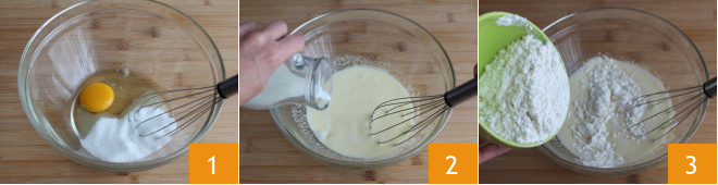 Um die glutenfreien Apfel-Schoko-Muffins zuzubereiten, Butter in einem kleinen Topf bei schwacher Hitze schmelzen und abkühlen lassen. In einer Schüssel das Ei (bei Zimmertemperatur) aufschlagen, den Zucker 1 hinzufügen und mit einem Schneebesen verrühren. Dann nach und nach die Milch (bei Zimmertemperatur) 2 unterrühren. Das Reismehl 3 ebenfalls einarbeiten.