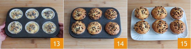 Die Küchlein sind bereit zum Backen 13: Im vorgeheizten Umluftofen bei 180° etwa 20 Minuten backen. Sobald sie fertig sind 14, die glutenfreien Apfel-Schoko-Muffins vor dem Genießen abkühlen lassen 15.