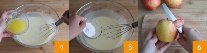 Die lauwarm abgekühlte geschmolzene Butter 4 und zum Schluss das Backpulver 5. Alles verrühren, dann die Äpfel schälen.