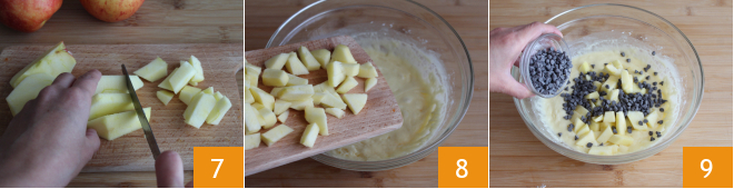 Die Äpfel in Würfel schneiden 7 und zum Teig geben 8. Zum Schluss einen Teil der Schokotropfen unterheben 9 und ein paar Esslöffel davon für die Oberfläche zurückbehalten.
