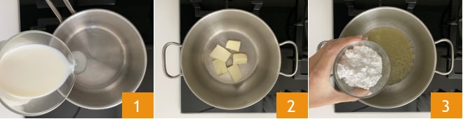 Um die glutenfreie Béchamelsauce zuzubereiten, beginnen Sie damit, die Milch in einem kleinen Topf zu erhitzen 1. In der Zwischenzeit lassen Sie in einem anderen Topf die Butter bei schwacher Hitze schmelzen 2. Sobald sie geschmolzen ist, schalten Sie den Herd aus und geben das gesamte Maisstärke auf einmal hinzu 3.
