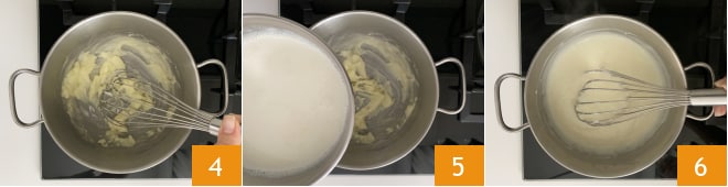 und rühren Sie zügig mit einem Schneebesen um 4. Schalten Sie den Herd bei niedriger Hitze wieder ein und fügen Sie ein wenig heiße Milch hinzu, gerade genug, um den Boden zu verdünnen 5, dann gießen Sie die restliche Milch dazu und rühren Sie schnell, um die Bildung von Klumpen zu vermeiden 6.