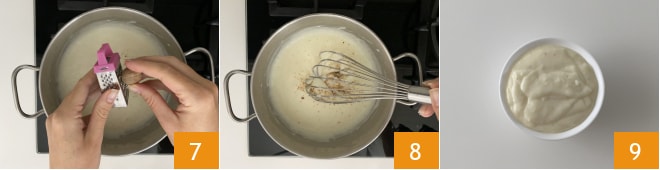 Lassen Sie die Béchamelsauce 4-5 Minuten kochen, die Sauce muss eindicken und den Siedepunkt erreichen. Am Ende der Kochzeit würzen Sie mit Salz, schwarzem Pfeffer und Muskatnuss 7. Ein letztes Umrühren 8 und Ihre glutenfreie Béchamelsauce ist bereit zur Verwendung 9.