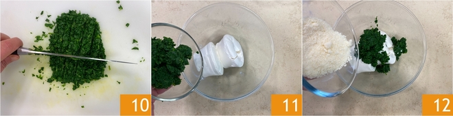Hack den Spinat mit einem Messer klein 10. In einer Schüssel den abgetropften Ricotta und den gekochten Spinat 11 mischen, dann mit geriebenem Parmigiano Reggiano würzen 12.
