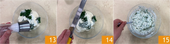 Fügen Sie eine Prise Salz 13 und Muskatnuss 14 hinzu. Mischen, um alles zu kombinieren 19.