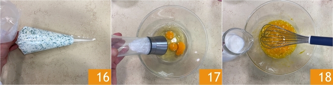 Geben Sie die Füllung in einen Spritzbeutel ohne Tülle 16 und bewahren Sie sie im Kühlschrank auf. Gehen Sie zur Zubereitung der glutenfreien Crêpes über: Brechen Sie in einer Schüssel die Eier auf und fügen Sie eine Prise Salz hinzu 17. Geben Sie die Milch hinzu 18 und rühren Sie weiter, bis Sie einen glatten und flüssigen Teig erhalten.