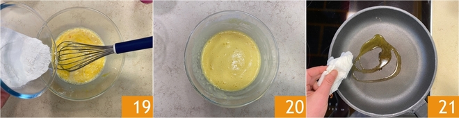 Fügen Sie schließlich das Reismehl hinzu und rühren Sie mit dem Schneebesen, um eventuelle Klumpen zu entfernen 19: Der Teig ist fertig 20. Jetzt die Crêpes kochen: Öl in eine beschichtete Pfanne mit einem Durchmesser von 20 cm geben und mit einem Küchentuch abtupfen, um den Überschuss zu entfernen und gleichmäßig zu verteilen 21.
