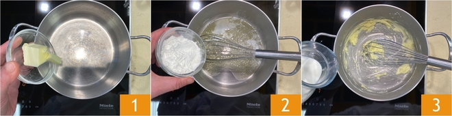 Um die glutenfreien Crêpes zuzubereiten, beginnen Sie zuerst mit der Béchamelsauce: Schmelzen Sie die Butter bei niedriger Hitze in einem Topf 1, dann geben Sie die Stärke hinzu und kochen Sie unter Rühren mit einem Schneebesen etwa 1 bis 2 Minuten, um eine Mehlschwitze zu erhalten 2. In der Zwischenzeit erhitzen Sie die Milch 3, dann gießen Sie sie nach und nach in den Topf und rühren kräftig um.