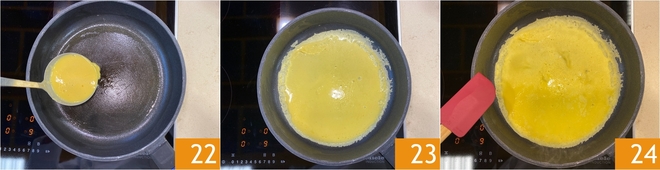 Geben Sie eine Kelle Teig in die Mitte 22 und verteilen Sie ihn, indem Sie die Pfanne schwenken oder mit dem speziellen Crêpes-Werkzeug, bis die gesamte Oberfläche bedeckt ist 23. Bei mittlerer bis niedriger Hitze ein paar Minuten kochen 24.