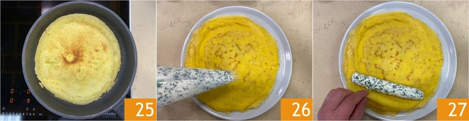 Wenden Sie die Crêpe mit einem Spatel und lassen Sie sie auch auf der anderen Seite 1-2 Minuten goldbraun werden 25. Fahren Sie fort, bis der gesamte Teig aufgebraucht ist, und stapeln Sie die Crêpes auf einem Teller; mit diesen Mengen erhalten Sie insgesamt 6 Crêpes. Drücken Sie nun einen Streifen Füllung auf den unteren Rand jeder Crêpe 26, rollen Sie sie dann vorsichtig auf 27.