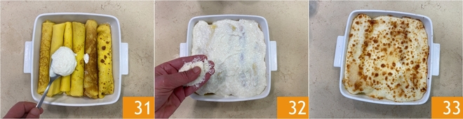 Sie sollten eine Rolle erhalten 28. Nehmen Sie eine Auflaufform von 20x20 cm und verteilen Sie etwas Béchamelsauce auf dem Boden 29. Legen Sie die gefüllten Crêpes nebeneinander 30.