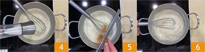 Kochen Sie weiter, bis die Sauce eindickt, dies dauert etwa 5 Minuten. Zum Schluss salzen 4 und mit Muskatnuss würzen 5, dann abkühlen lassen 6.
