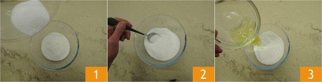 Um die glutenfreien Kokosplätzchen zuzubereiten, geben Sie die Kokosraspeln in eine Schüssel und fügen Sie den Kristallzucker hinzu 1, mischen Sie mit einem Löffel 2 und fügen Sie das Eiweiß hinzu 3