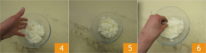Vermischen Sie alles gründlich und kneten Sie es mit Ihren Händen 4, bis Sie eine gleichmäßige Masse erhalten 5. Nehmen Sie nun eine kleine Menge der Masse, etwa 5-6 Gramm, und formen Sie sie mit den Händen zu einem Kegel 6